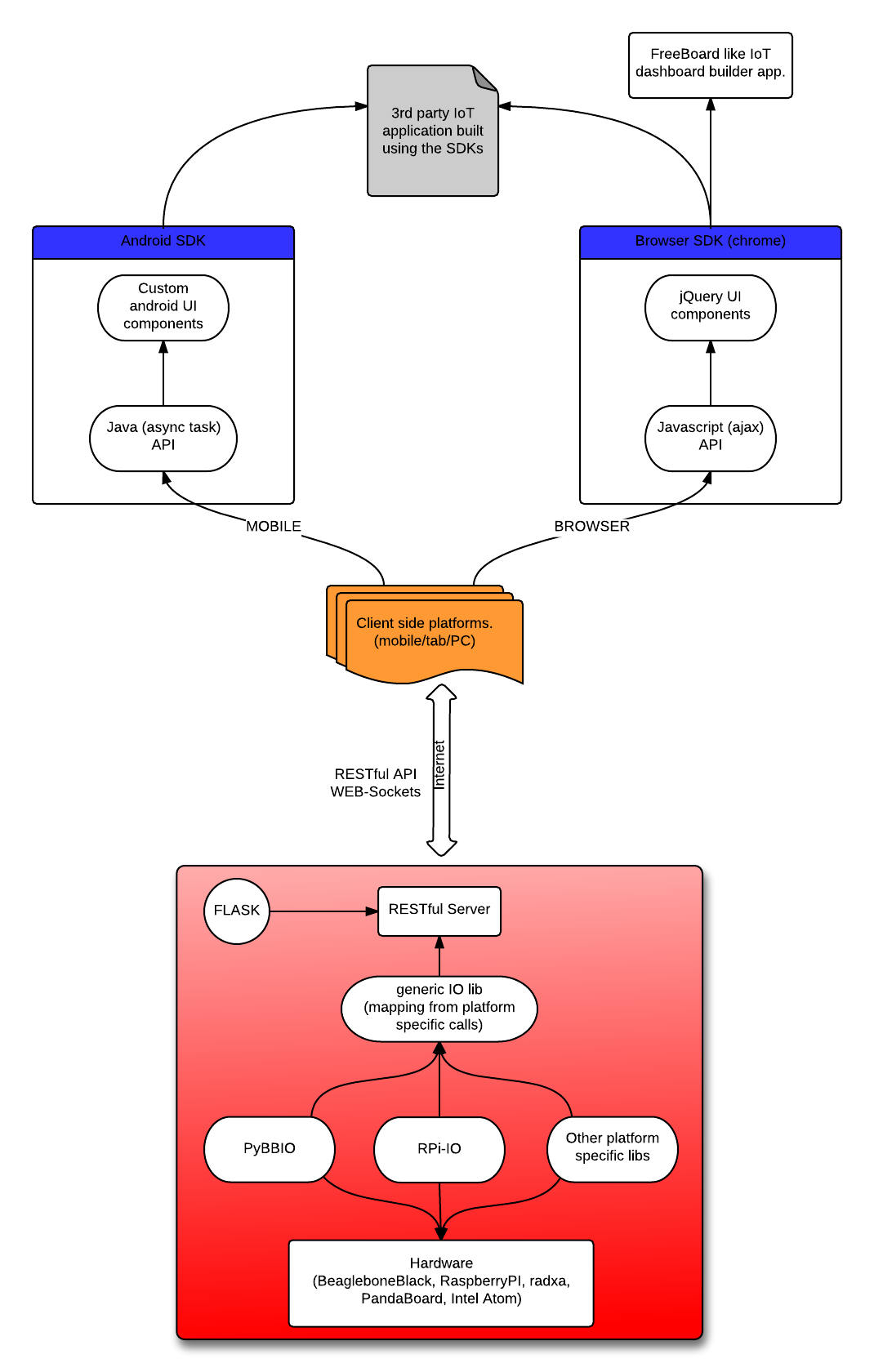 The base block seen in red represents the hardware platform (Raspberry PI, Beaglebone Black, Radaxa board, etc.) on which the application runs on. The platform should have a python based IO library which the zygote server can utilize. There is a generic IO library mapping that happens which maps the board specific python functions to a generic interface which the zygote-server (Flask based RESTful server) uses. This layer also takes a python dictionary which contains the board configurations. The Flask server will use the generic interface to expose a REST api to the external world.